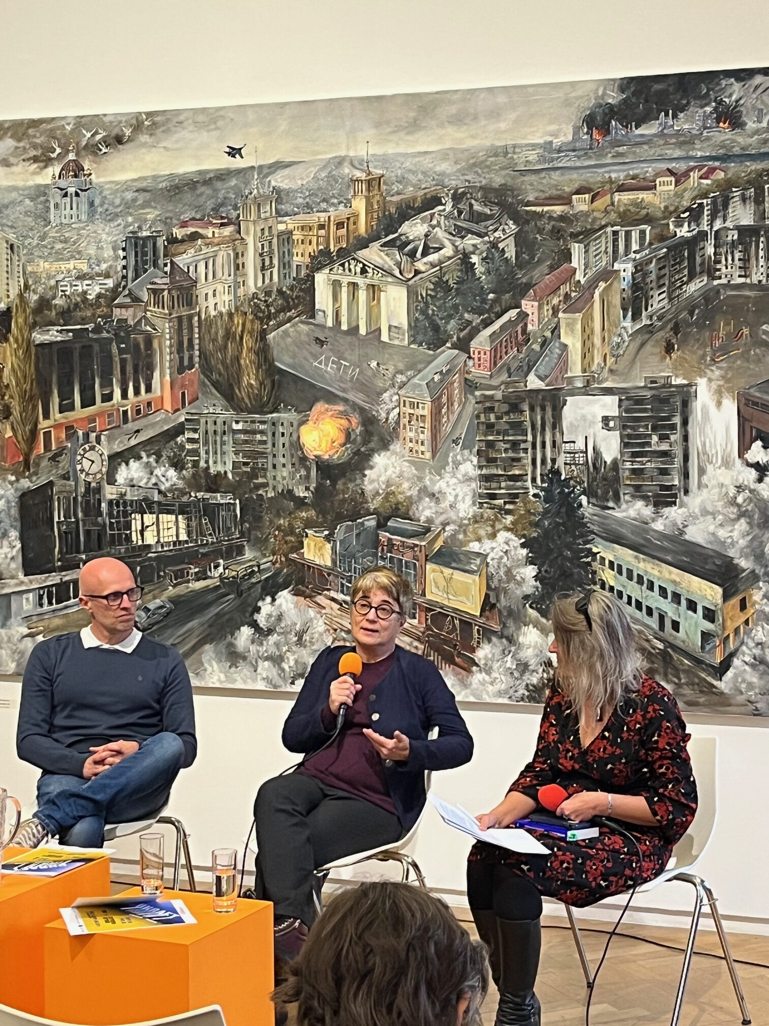 A l’invitation de Patrick MICALE, Président de l’association Vernon-Ternopil,et encadré par 2 éminents spécialistes de l’Ukraine :Nicolas TENZER, Ecrivainet Jérôme BARBOSA, Photographe,une belle présentation animée par des photos et vidéos sur le travail de la création de l’œuvre par l’artiste peintre Olesia TROFYMENKO. Beaucoup d’émotions.